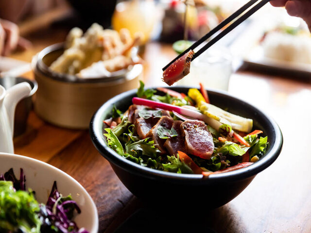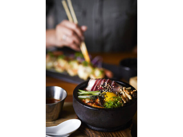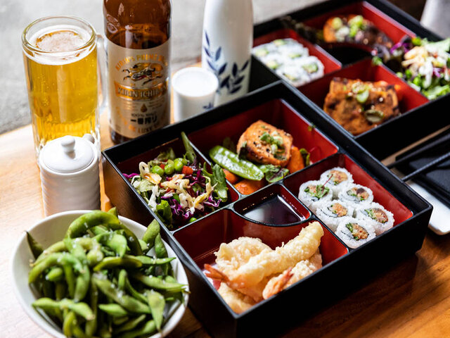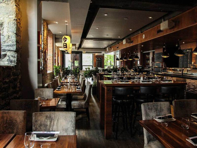 True to form, this lively drinking hub places significant emphasis on its edibles. Oceanic delicacies, by way of fresh sashimi, nigiri and creative maki options, add colourful notes to an extensive menu that includes kushiyaki (grilled meat, seafood and vegetable skewers), noodles and fried specialties such as karaage, agedashi and korokke.