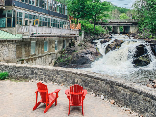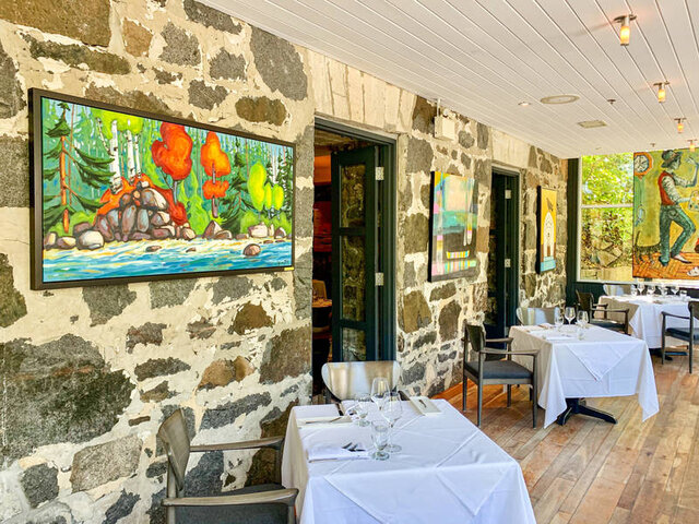 This restaurant is embraced by the Wakefield Mill’s stone walls, warmed by a large open-hearth double-sided fireplace, and extended with a glassed-in solarium overlooking MacLaren Falls. Guests dine in the dining room where much attention and effort is focused on meeting and surpassing their every expectation.