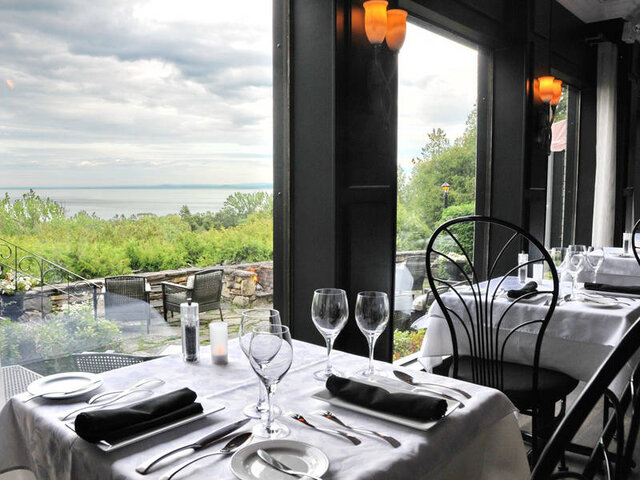 This restaurant perched on the heights overlooking La Malbaie features refined regional cuisine served in its panoramic dining room or on the covered, heated patio. It is located at Auberge des Falaises, where you can top off your evening with a relaxing visit to the Nordic spa($).
