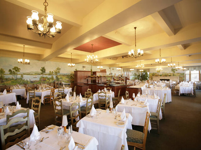 Dining room featuring dishes inspired by regional products. Enjoy your meal while admiring the beautiful mural and walls lined with items from the Coverdale Collection, which capture the rich history of the past.