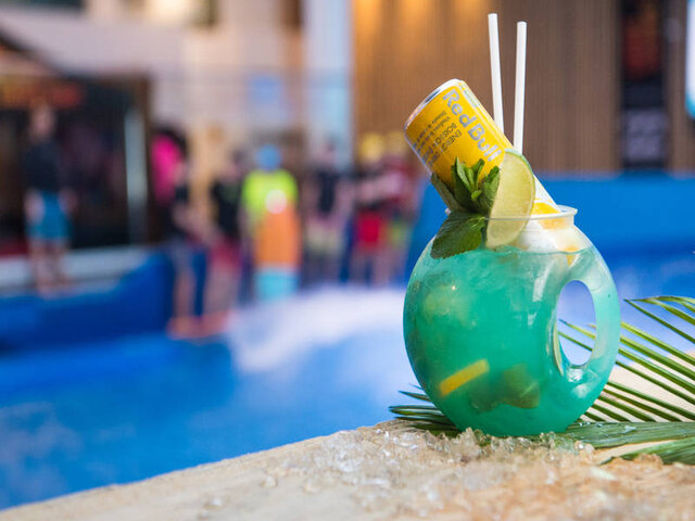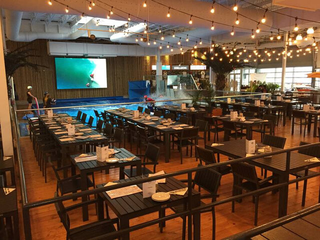 Welcome to ‘Le Turf,’ a unique restaurant concept in Canada. Enjoy a variety of dishes including fish tacos, burgers, jerk chicken and poke bowls, and sip on a drink as you watch surfers take on the only indoor surfing wave in the country.