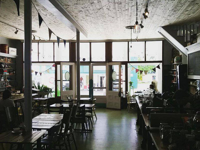 Café convivial à l’ambiance authentiquement rétro d’un ancien magasin général, en plus d’être une boutique-vitrine pour les produits des artisans locaux.